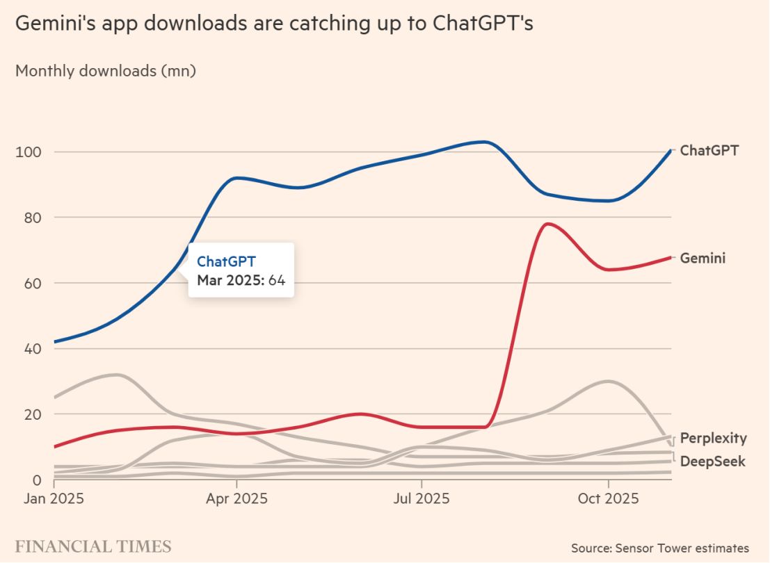 另据 Sensor Tower 的数据,在 App 下载量上,虽然 ChatGPT 依然以约 8700 万的月度下载量领先,但 Gemini 的追赶速度非常惊人,从 2025 年年中每月约 1500 万下载,一路飙升到 10 月底的约 6600 万。