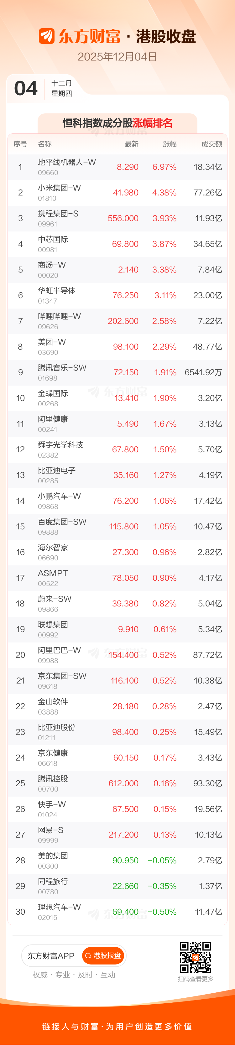 港股 12 月 4 日收盘走高,恒生指数收报 25935.9 点,涨 175.17 点,涨幅 0.68%;恒生科技指数收报 5615.43 点,涨 80.51 点,涨幅 1.45%。恒生指数成分股中药明生物、药明康德、小米集团-W 涨幅居前,申洲国际、金沙中国有限公司、港铁公司跌幅靠前。恒生科技指数成分股中地平线机器人-W、小米集团-W、携程集团-S 涨幅居前,理想汽车-W、同程旅行、美的集团跌幅靠前。