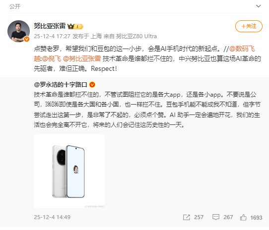 中兴通讯副总裁、努比亚旗舰产品总经理张雷转发罗永浩微博表示,希望这是 AI 手机时代的新起点。