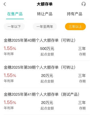 农业银行一款 3 年期大额存单起点金额则更高,农行 「金穗 2025 年第 40 期个人大额存单」 以 500 万元起购。另一款 「金穗 2025 年第 39 期个人大额存单」 仍以 20 万元起购,两款产品利率均为 1.55%,显示剩余额度紧张。