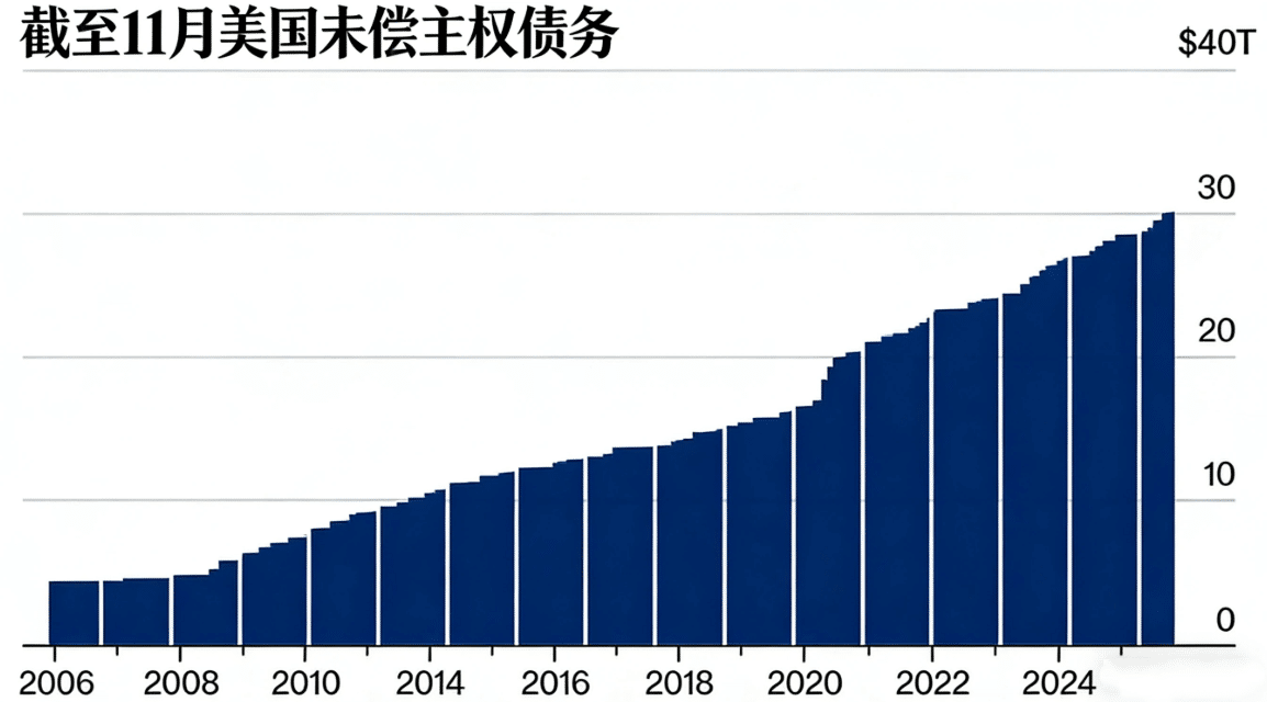 美国国债市场规模首次突破 30 万亿美元——自 2018 年以来规模已翻倍有余,疫情时期的借贷激增正产生持续影响。