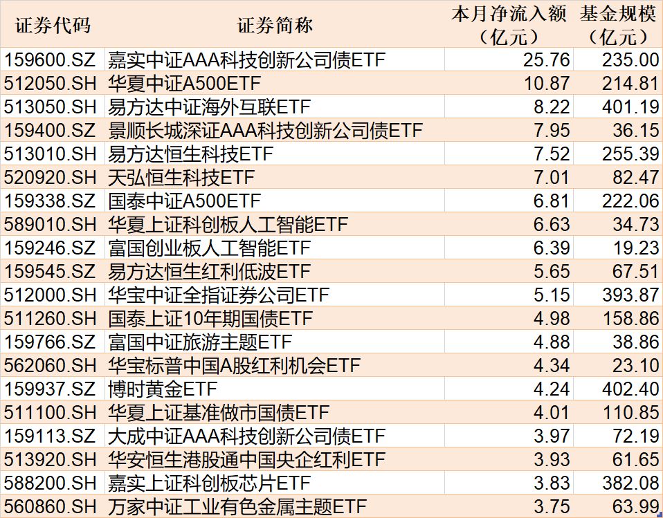 与此同时,博时上证 30 年期国债 ETF 份额减少 0.04 亿份,对应净流出 3.7 亿元;华宝中证银行 ETF 份额减少 3.86 亿份,录得净流出 3.21 亿元;永赢中证沪深港黄金产业股票 ETF 份额减少 1.58 亿份,出现净流出 3.09 亿元。