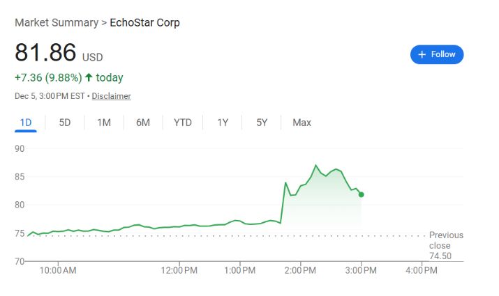 受相关消息及业务合作推动,与 SpaceX 达成频谱交易的 EchoStar 股价一度大涨 18%,随后涨幅收窄至 10%。