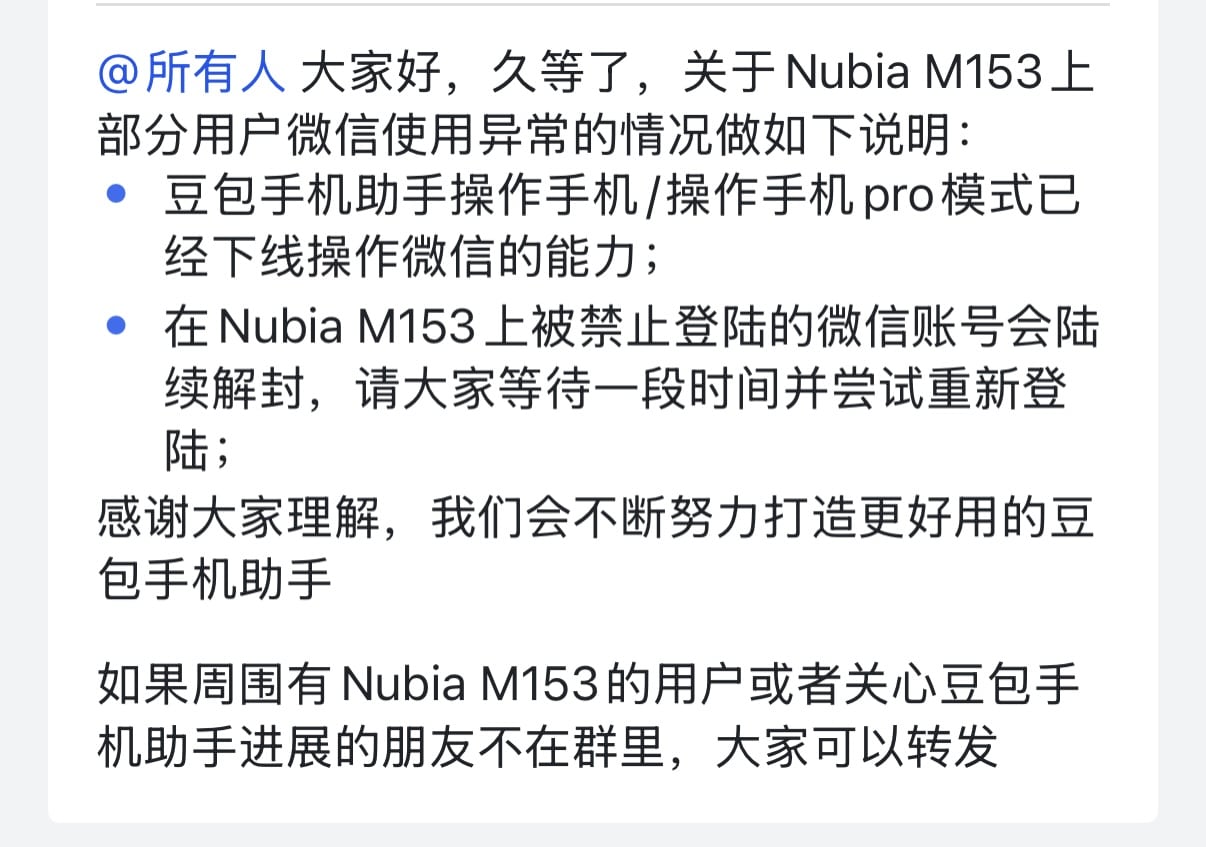 12 月 3 日,豆包手机助手团队回应称,后续已下线手机助手操作微信的能力,样机上被禁止登录的微信账号正陆续解封,请用户等待一段时间并尝试重新登录。微信方面则表示,并没有特别动作,可能是触发了微信原有的安全风控措施。
