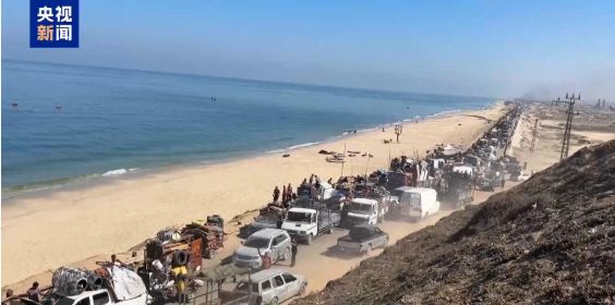 从加沙城撤出的民众用三轮车、驴车等交通工具载着家中仅有的一些生活用品颠簸前行,而那些没有交通工具的家庭只能拖着或背着行李徒步踏上逃亡之路。他们只有一个目标,就是希望能找到一个安全的栖身之所。