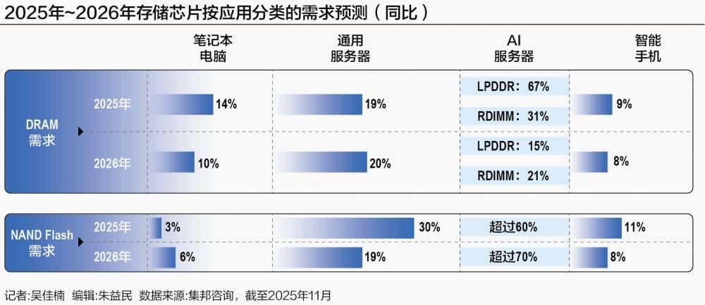 与明年智能手机与笔记本电脑出货增速预估下调不同的是,通用服务器和 AI 服务器 2026 年对于 DRAM 和 NAND Flash 需求将保持高速增长,远超于来自笔记本电脑和智能手机的需求。
