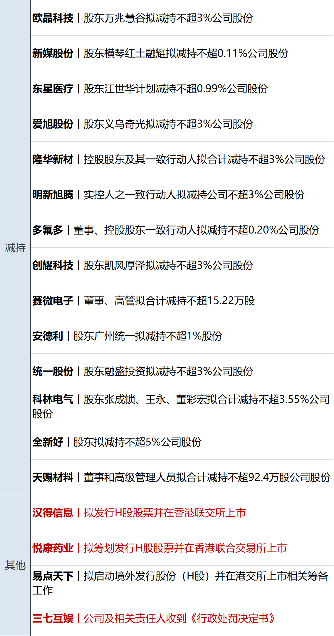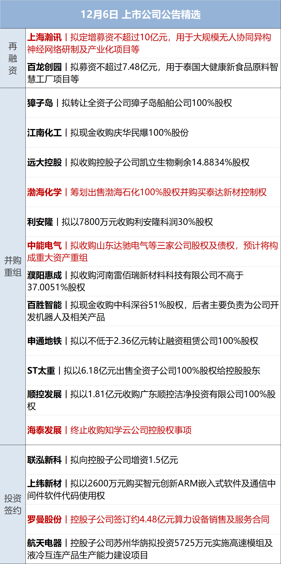 渤海化学 (SH600800,股价 5.05 元,市值 56.06 亿元):12 月 5 日晚间,渤海化学发布公告称,公司正在筹划向控股股东天津渤海化工集团有限责任公司出售天津渤海石化有限公司 100% 股权,并通过发行股份及支付现金的方式购买安徽泰达新材料股份有限公司的控制权。本次交易预计构成重大资产重组,不会导致实控人变更,不构成重组上市。鉴于交易事项尚处于筹划阶段,有关事项存在不确定性,为避免造成股价异常波动,渤海化学自 2025 年 12 月 8 日起开始停牌,预计停牌时间不超过 10 个交易日。