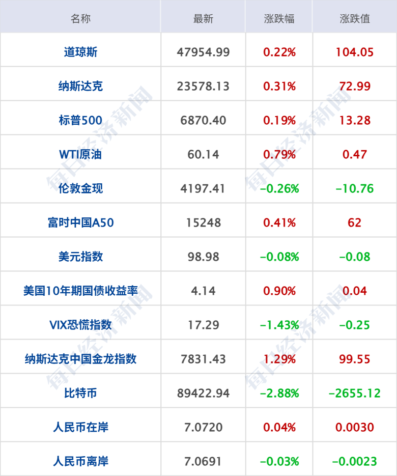 美股三大指数小幅收涨,道指涨 0.22%,纳指涨 0.31%,标普 500 指数涨 0.19%,大型科技股多数上涨,博通涨超 2%,谷歌、Meta 涨超 1%,苹果、英伟达跌幅不足 1%;存储概念、零售百货涨幅居前,SanDisk 涨超 7%,美光科技涨超 4%,梅西百货、迪拉德百货涨超 2%;加密货币概念、综合油气跌幅居前,Strive 跌超 7%,英国石油跌超 3%,道达尔、埃尼石油、Circle 跌超 2%。纳斯达克中国金龙指数涨 1.29%,中概股多数上涨,百度涨超 5%,万国数据涨超 4%,小鹏汽车、爱奇艺、好未来涨超 2%。