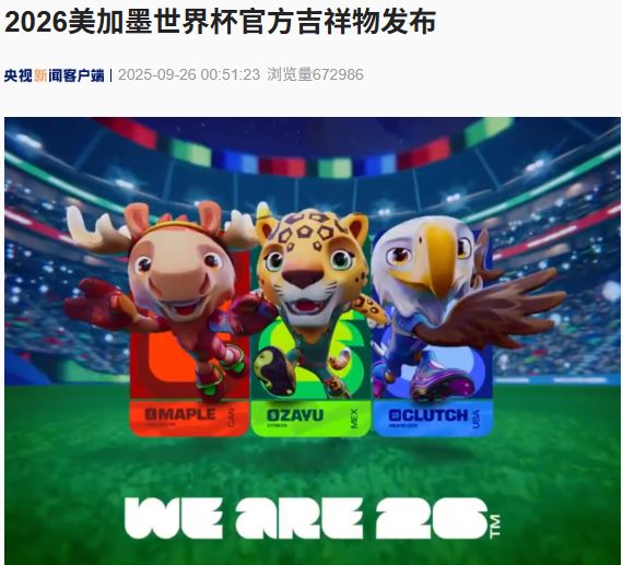 另据央视新闻,当地时间 2025 年 9 月 25 日,国际足联发布 2026 年美加墨世界杯三个官方吉祥物:名为 「梅普尔」(Maple) 的驼鹿、名为 「萨尤」(Zayu) 的美洲豹和名为 「克拉奇」(Clutch) 的白头海雕,分别象征着加拿大、墨西哥和美国三个举办国的文化传承,彰显首次由三个国家举办的世界杯 「团结、创新、多元」 的核心理念。