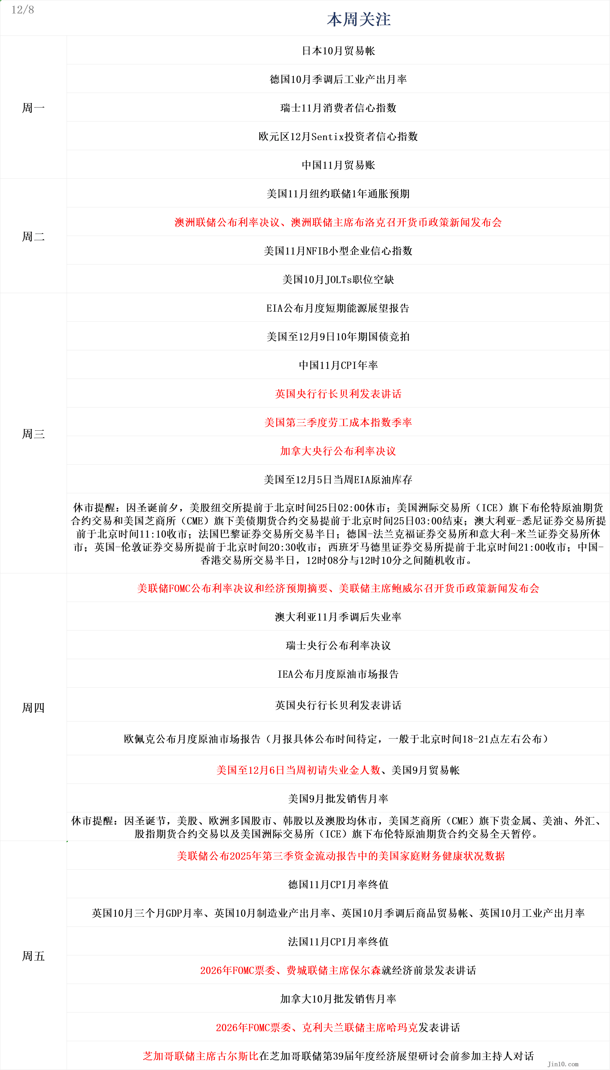 周四,因圣诞节,美股、欧洲多国股市、韩股以及澳股均休市,美国芝商所 (CME) 旗下贵金属、美油、外汇、股指期货合约交易以及美国洲际交易所 (ICE) 旗下布伦特原油期货合约交易全天暂停。