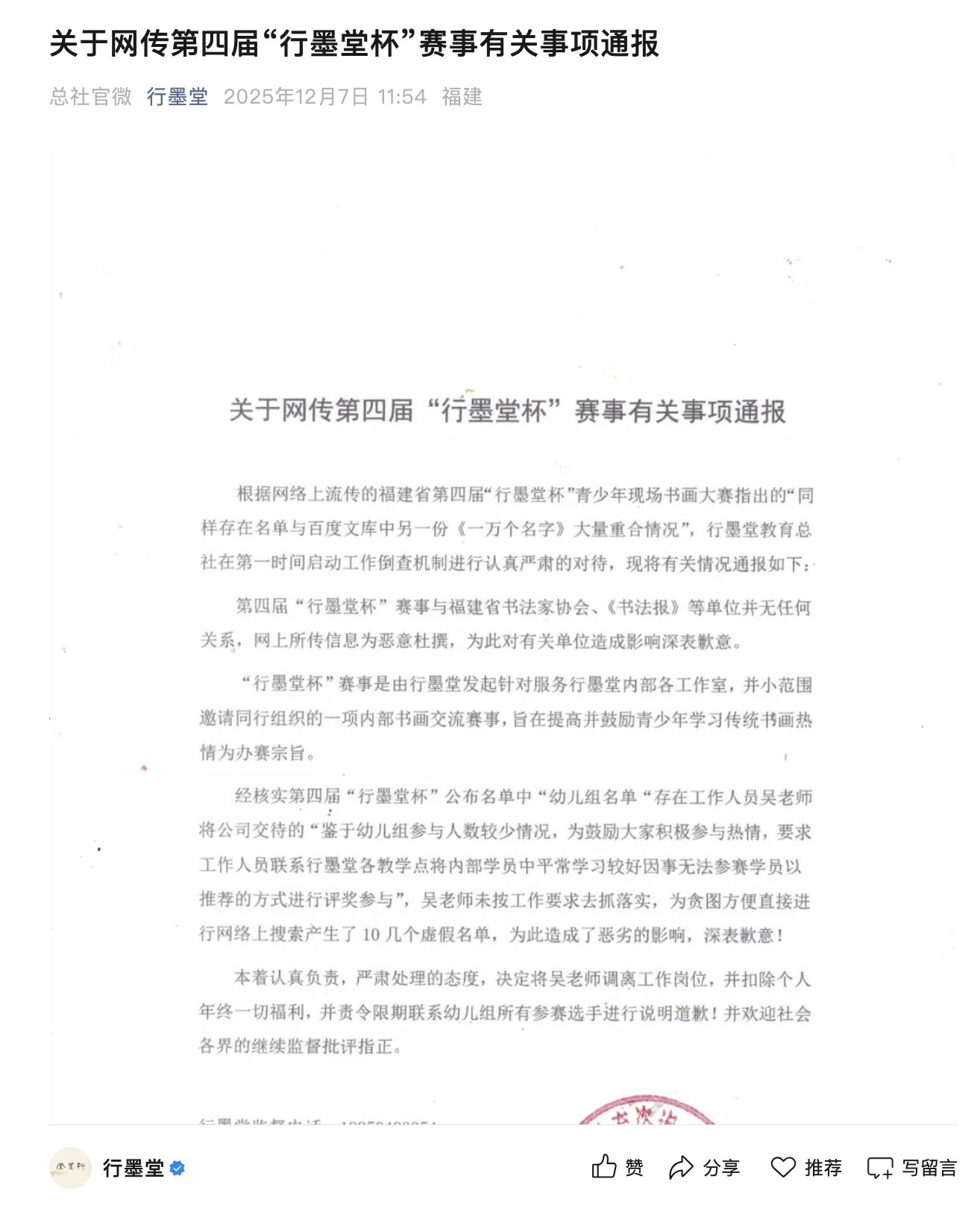 12 月 7 日,上述书画大赛主办方行墨堂教育咨询有限公司发布通报,公开回应此事。该公司称,经核实,因赛事中幼儿组参与人数较少,为鼓励大家积极参与,公司要求工作人员联系各教学点,将部分学习较好但因事无法参赛的学员以推荐的方式参赛评奖。「但工作人员吴老师却未落实工作要求,为贪图方便,直接通过网络搜索的方式产生了十几个虚假名单,因此造成了恶劣影响。」