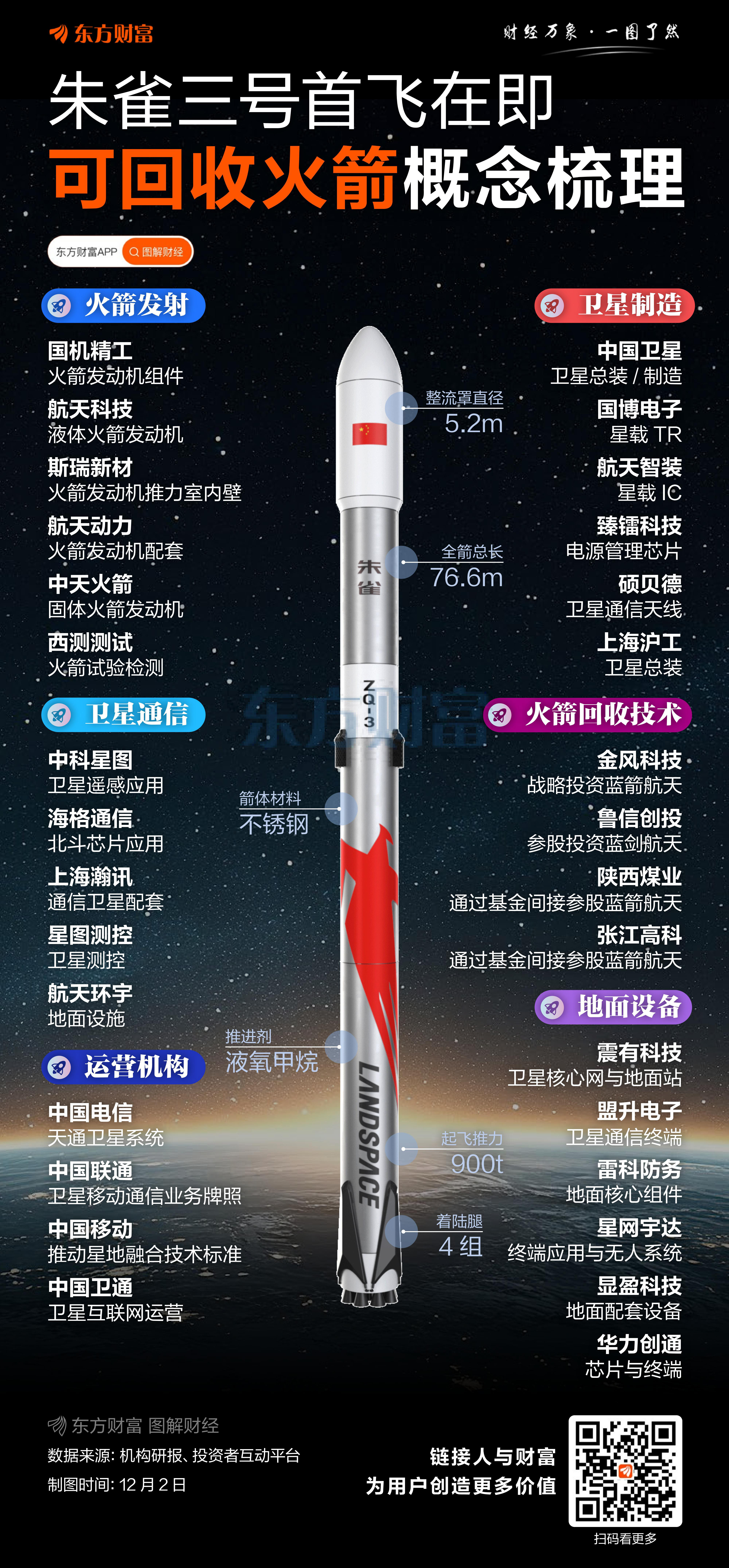 此外,东吴证券表示,2025 年底开始,朱雀三号、天龙三号、引力二号、双曲线三号、智神星一号等一批新型号商业火箭将按计划迎来首发,这批可复用火箭如果实现可回收,有望助力国内低轨卫星星座组网加速落地。