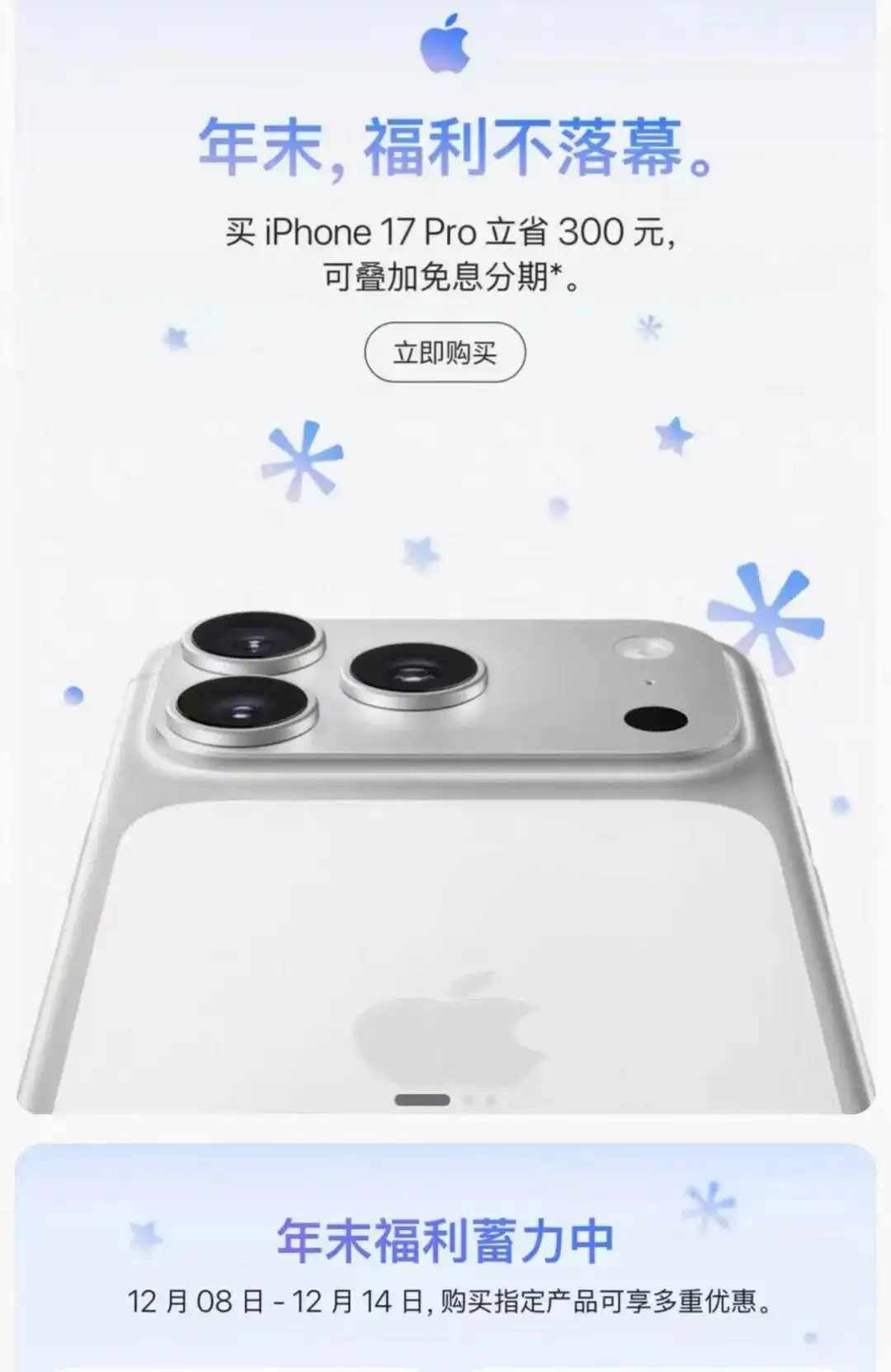 今日,Apple Store 官方旗舰店在电商平台推出年末降价活动,iPhone 17 Pro 及 iPhone 17 Pro Max 机型降价 300 元,降价后 iPhone 17 Pro 售价 8699 元起,iPhone 17 Pro Max 售价 9699 元起。
