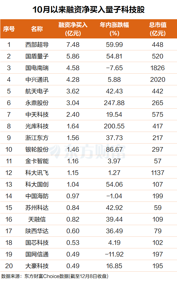 东方财富Choice 数据显示,自 10 月以来,杠杆资金净买入多只量子科技概念股,其中中兴通讯排名第一,融资净买入超 7 亿元;国盾量子排名第二,融资净买入接近 6 亿元。