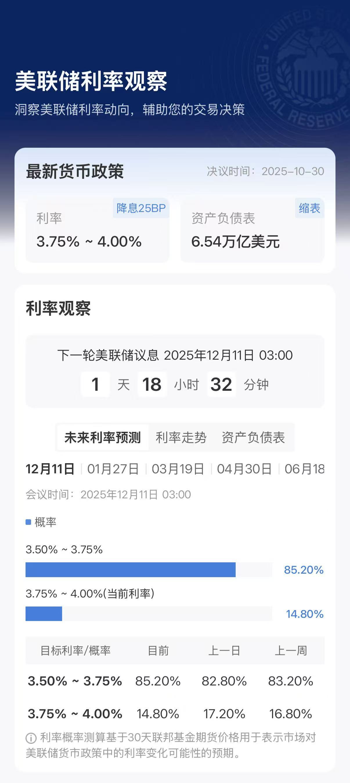 据 CME「美联储观察」:美联储 12 月降息 25 个基点的概率为 89.4%,维持利率不变的概率为 10.6%。美联储到明年 1 月累计降息 25 个基点的概率为 68.5%,维持利率不变的概率为 7.8%,累计降息 50 个基点的概率为 23.8%。