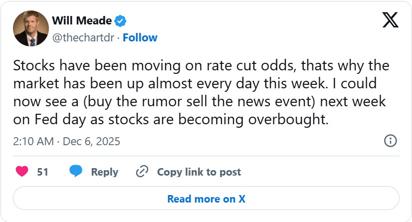 但格雷切克表示,更重要的并非市场似乎已消化的 12 月降息,而是明年的额外降息。他称,根据不同信源,投资者预计 2026 年还将有 2 至 4 次降息。这些额外降息才是真正可能推动市场走高、开启 「圣诞老人行情」 的关键。