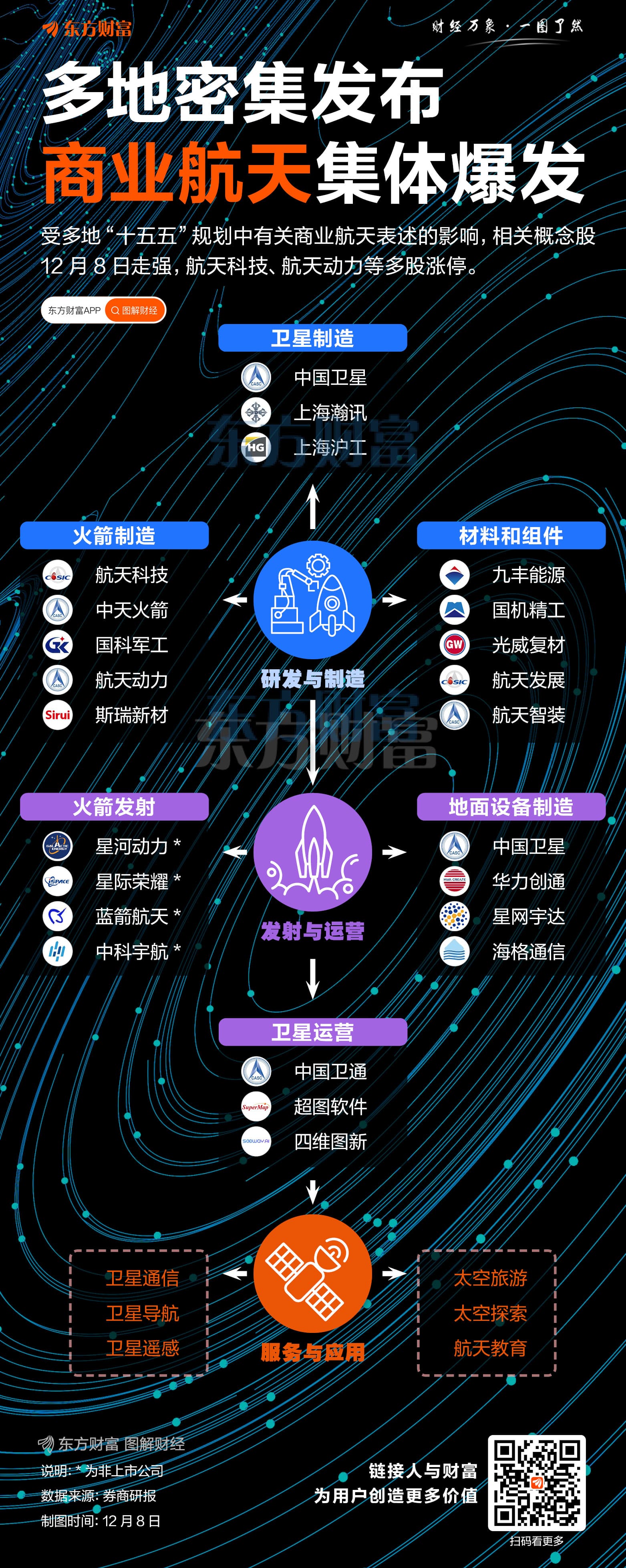 商业航天板块 12 月 8 日继续拉升,指数再刷历史新高,板块中达华智能、天箭科技、通宇通讯、吉大正元、航天动力、航天科技等 10 股涨停。