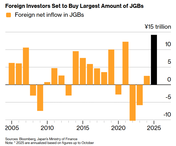 这一转变发生在日本政策制定者的敏感时期。就在日本央行缩减自身购债规模之际,首相高市早苗推出了自疫情限制放松以来该国最大规模的一揽子支出计划。日本国债收益率目前已处于数十年来的高位。从对冲基金到全球资产管理公司,这些新入场的投资者既代表着一股需求力量,也构成了一层波动性风险,这种波动可能从东京 7.4 万亿美元的债券市场蔓延至美国国债、英国金边债券和德国国债。