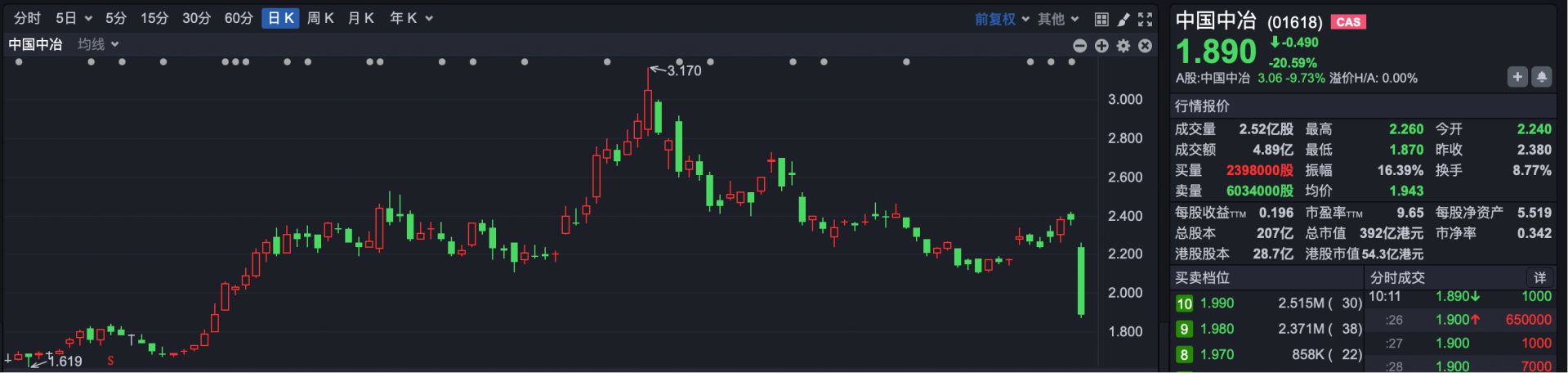 12 月 9 日早盘,中国中冶股价突发异动,A 股股价逼近跌停,港股股价一度跌超 20%。