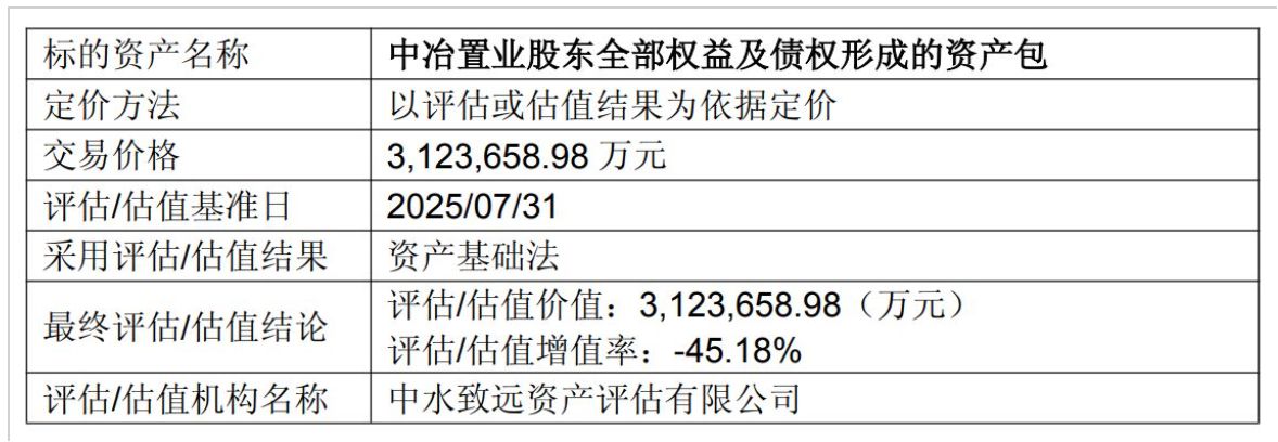 值得注意的是,根据公告,本次交易标的一为中冶置业 100% 股权以及公司对中冶置业的标的债权,交易对价为 312.37 亿元。评估报告显示,截至评估基准日 2025 年 7 月 31 日,交易标的一评估减值率高达 45.18%。对此,中国中冶坦言,减值的主要原因在于该资产包中所涉资产的市场价值下降。