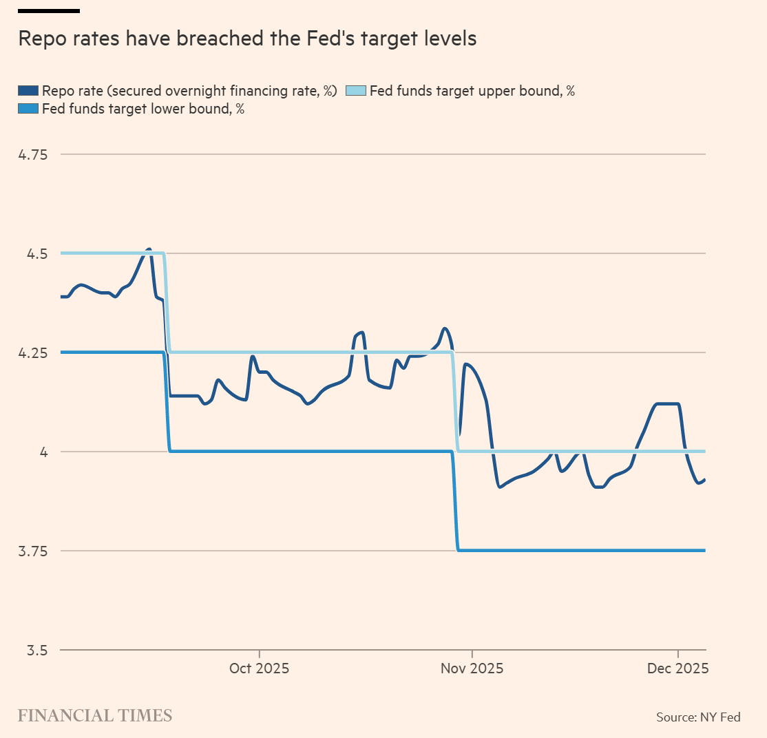 今年 10 月,为应对回购市场日益加剧的压力,美联储宣布将到期国债和抵押贷款支持债券的本金,重新投资于短期国库券。但这一举措并未完全奏效:隔夜利率频繁突破美联储目标区间,银行持续依赖央行的流动性支持工具——常备回购便利工具 (standing repo facility)。