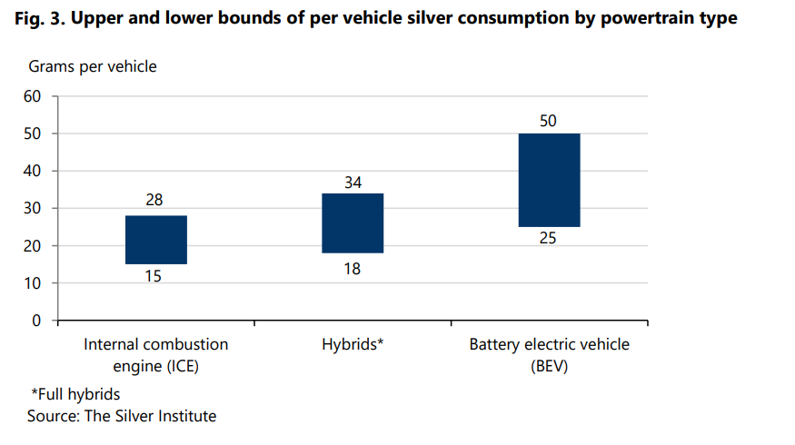 电动汽车革命正推动白银需求大幅增长。电动汽车所需白银量远超传统内燃机汽车 (ICE),白银被广泛应用于电池管理系统、电力电子设备、充电基础设施及电触点等多个部件。从内燃机汽车向电动汽车的转型,预计将显著提振白银需求;尤其是纯电动汽车,平均耗银量比内燃机汽车高出 67%-79%,每辆电动汽车的用银量约为 25-50 克。