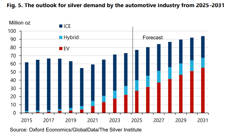 报告预测,2025 年至 2031 年间,全球汽车领域的白银需求复合年增长率 (CAGR) 将达 3.4%。牛津经济研究院表示,电动汽车需求与产量的快速增长意味着,到 2027 年,电动汽车将取代内燃机汽车,成为汽车领域白银需求的主要来源,且到 2031 年占比将达 59%。此外,汽车电动化还需要同步扩大充电基础设施,这也将进一步增加白银需求。