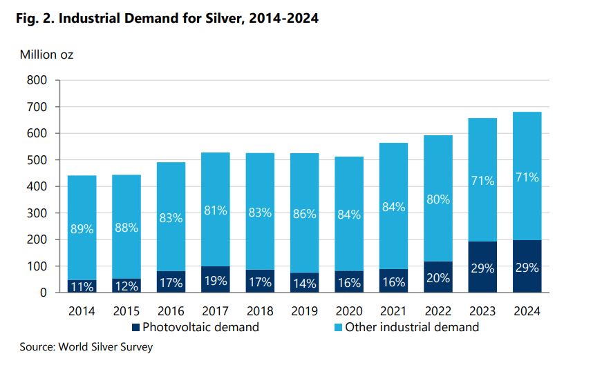 随着全球各国致力于可再生能源转型、太阳能装机容量不断扩大,太阳能光伏技术已成为白银需求中最重要且增长最快的应用领域之一。仅这一领域就有望持续占据白银总需求的相当大份额。2014 年,该领域仅消耗 11% 的白银工业需求,而 2024 年这一比例已升至 29%。