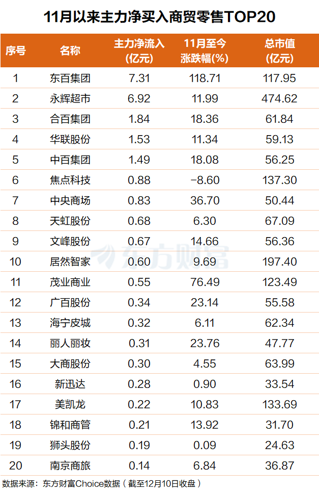 具体来看,东百集团排名第一,主力净买额超 7 亿元;永辉超市排名第二,主力净买额 6.9 亿元。