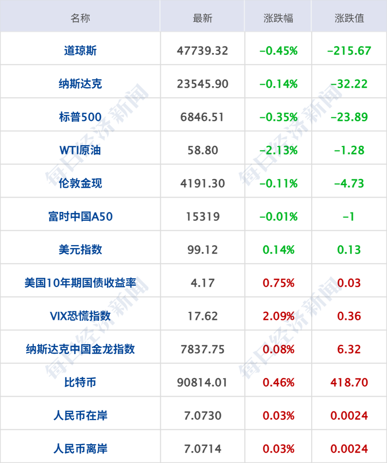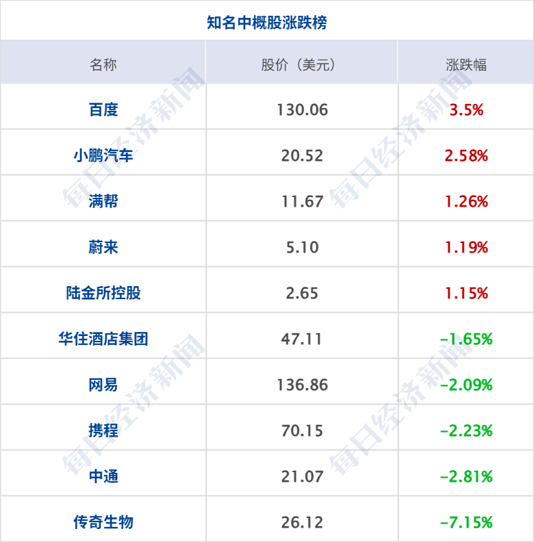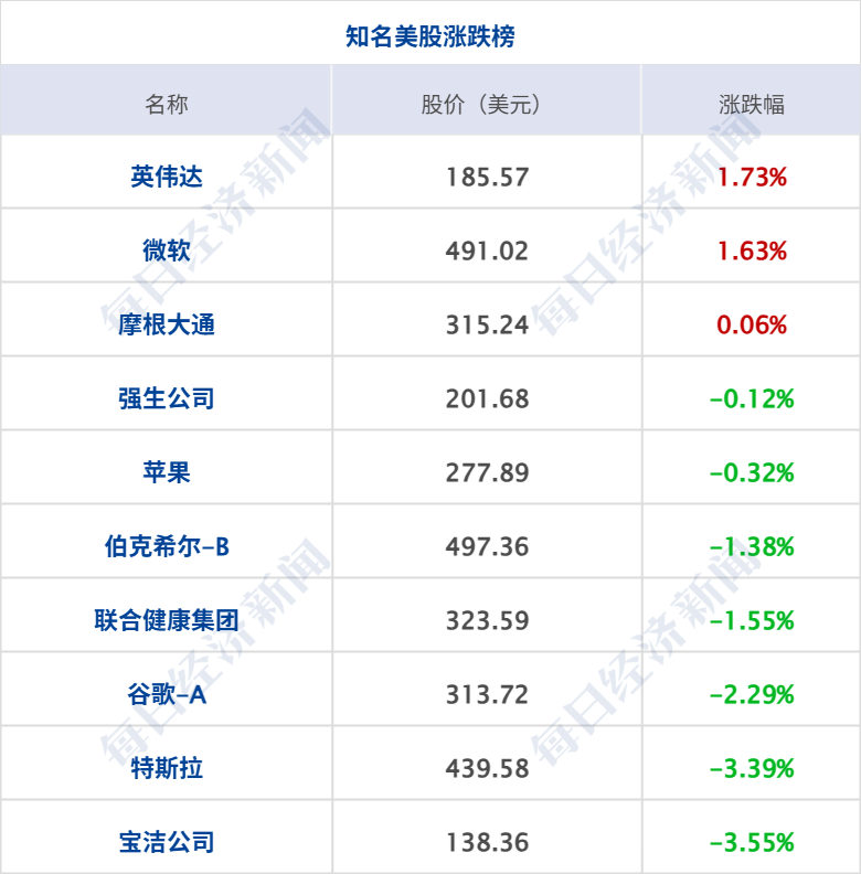 美股三大指数集体收跌,道指跌 0.45%,纳指跌 0.14%,标普 500 指数跌 0.35%,大型科技股多数下跌,特斯拉跌超 3%,谷歌跌逾 2%,亚马逊跌超 1%,脸书跌近 1%,苹果跌 0.32%;微软、英伟达涨超 1%。纳斯达克中国金龙指数涨 0.08%,中概股涨跌不一,高途、世纪互联涨超 4%,百度、名创优品涨超 3%,小鹏汽车、新东方涨超 2%,网易跌超 2%,爱奇艺跌近 1%。