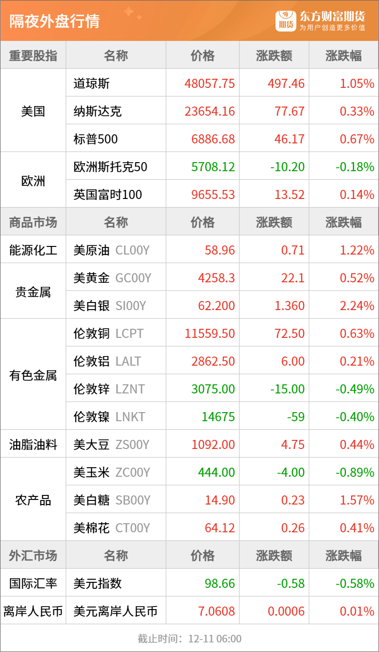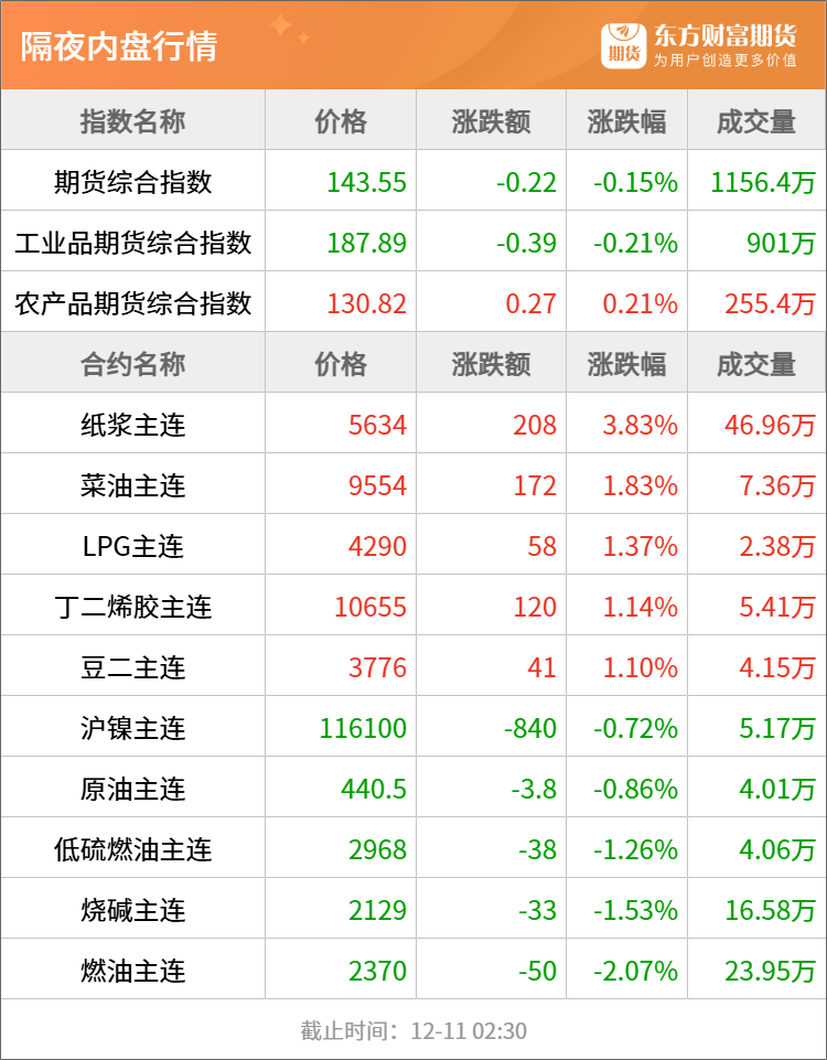钢材:截止 12 月 10 日当周,据找钢网数据显示,全国重点钢材品种产量 418.08 万吨,较上周减少 17.01 万吨;厂库 368.94 万吨,较上周减少 6.42 万吨;社库 425.75 万吨,较上周减少 22.04 万吨;总库存 794.69 万吨,较上周减少 28.46 万吨;表需 446.54 万吨,较上周减少 30.53 万吨。(找钢网)