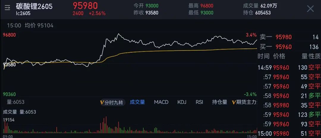 12 月 10 日,碳酸锂期货震荡上行,主力合约 LC2605 报收于 95980 元/吨,上涨 2.56%。
