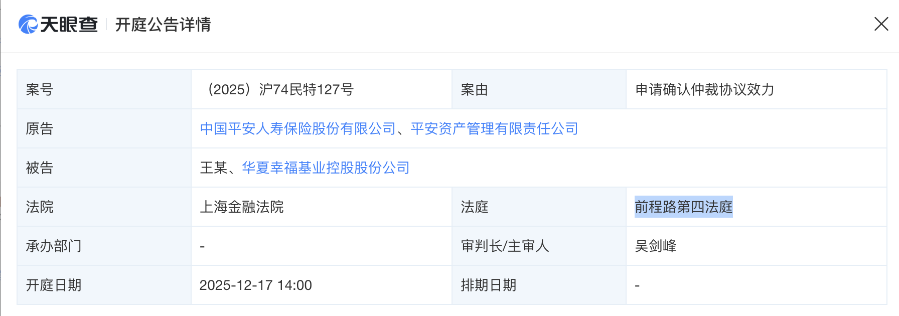 12 月 10 日,澎湃新闻注意到,天眼查信息显示,中国平安人寿保险股份有限公司及平安资产管理有限责任公司起诉华夏幸福基业控股股份公司 (华夏幸福,600340.SH) 及王某,案由为申请确认仲裁协议效力。这一案件将于 12 月 17 日 14 时在上海金融法院开庭。