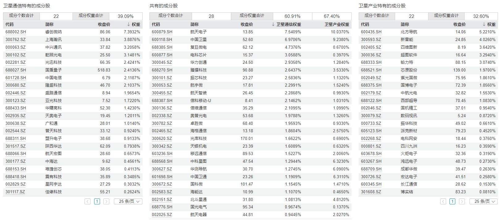 进一步对比两个指数,可以发现两个指数重合的成分股是 28 只,各自独有的成分股都是 22 只。其中国证商用卫星通信产业指数独有的成分股包括了睿创微纳、上海瀚讯、中兴通讯等,中证卫星产业指数独有的成分股包括了北方导航、新雷能、四维图新等。