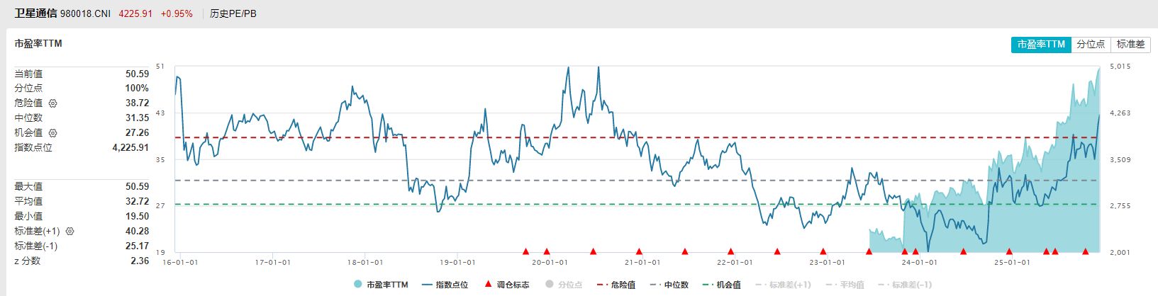 最后再对比两个指数的估值水平,Wind 数据显示,国证商用卫星通信产业指数的市盈率 TTM 处在历史 100% 分位的位置,不过实际的数据是从 2023 年 6 月开始,因此可对比数据的时间区间较短。