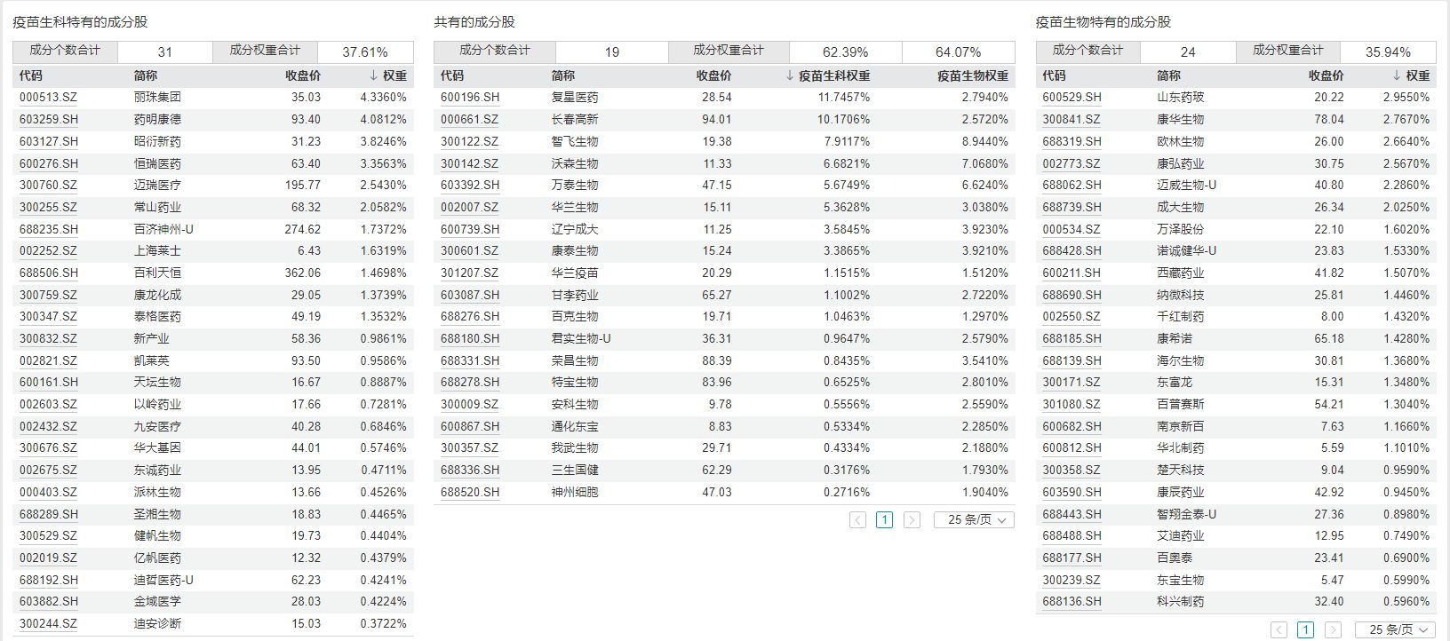 进一步对比两个指数的成分股,可以看到重合的成分股数量是 19 只,国证疫苗与生物科技指数独有的成分股数量是 31 只,中证疫苗与生物技术指数独有的成分股数量是 24 只。