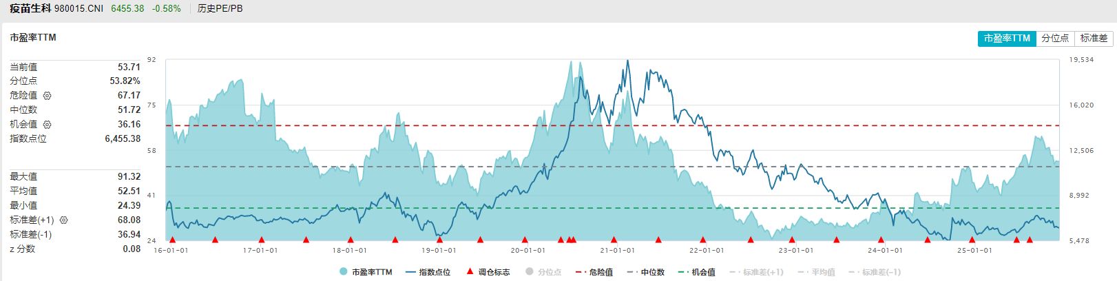 继续对比两个指数目前的估值水平,Wind 数据显示,国证疫苗与生物科技指数目前的市盈率 TTM 处在近十年中位数左右的位置,而中证疫苗与生物技术指数目前的市盈率 TTM 回升到历史 75% 分位以上。