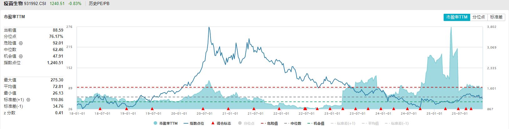 中证疫苗与生物技术指数是选取不超过 50 家业务涉及疫苗研发、疫苗生产、疫苗耗材、疫苗生产设备以及其他生物科技领域上市公司证券作为样本,目前成分股数量是 43 只,平均市值约 205 亿元。