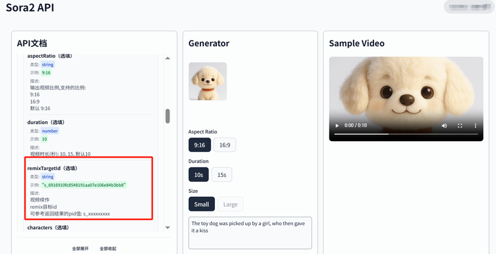 1. 核心参数 remixTargetId:这是 Remix 功能的关键,必须填入源视频的唯一标识 pid(格式通常为 s_xxxxxxxxxxxxxxx)。此 pid 可在视频第一次生成的成功响应中获取。