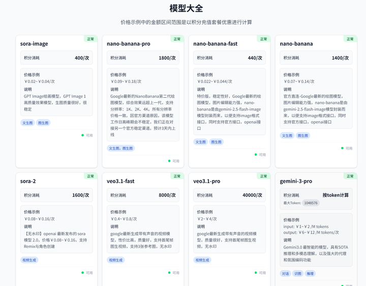 GrsAI 具备企业级服务的稳定性,在低价格的同时保证高成功率和全球可用性使其能够支撑大型商业项目。不仅提供 Sora2 的接入通道,作为一个综合性的 AI API 聚合平台,它还提供如 Nano Banana flase(图像生成)、Nano Banana Pro 、GPT-4o、Veo3.0/Veo3.1(视频生成)、Gemini 3(文本生成) 等多种主流模型的统一调用入口。这为开发者构建复杂的多模态 AIGC 工作流提供了极大便利,避免了在多个平台间切换和管理密钥的麻烦。