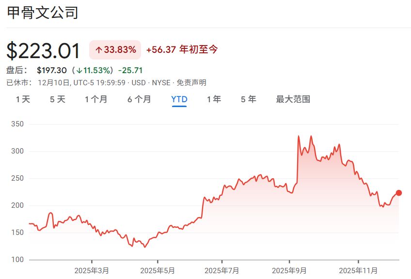 12 月 11 日,甲骨文股价盘前大跌超 12%。
