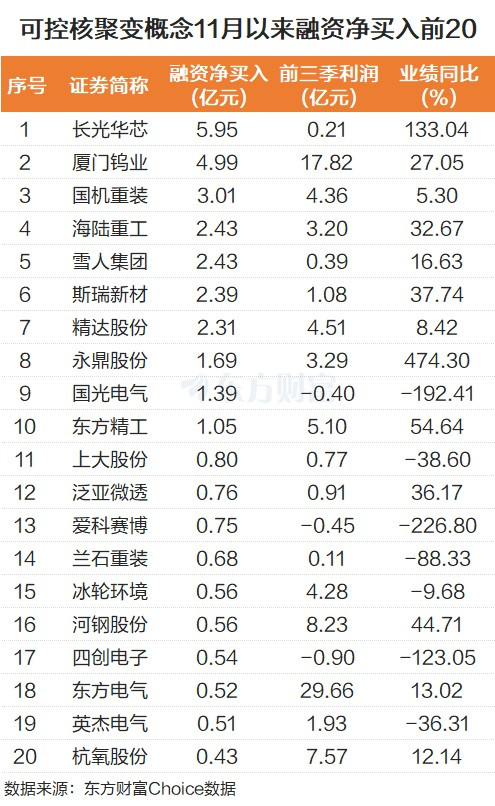 近来,可控核聚变概念也被杠杆资金积极抢筹,11 月以来合计净流入超 10 亿元。个股而言,长光华芯被融资净买入最多,为 5.95 亿元。该股前三季度归母净利润为 0.21 亿元,同比增长 133.04%。