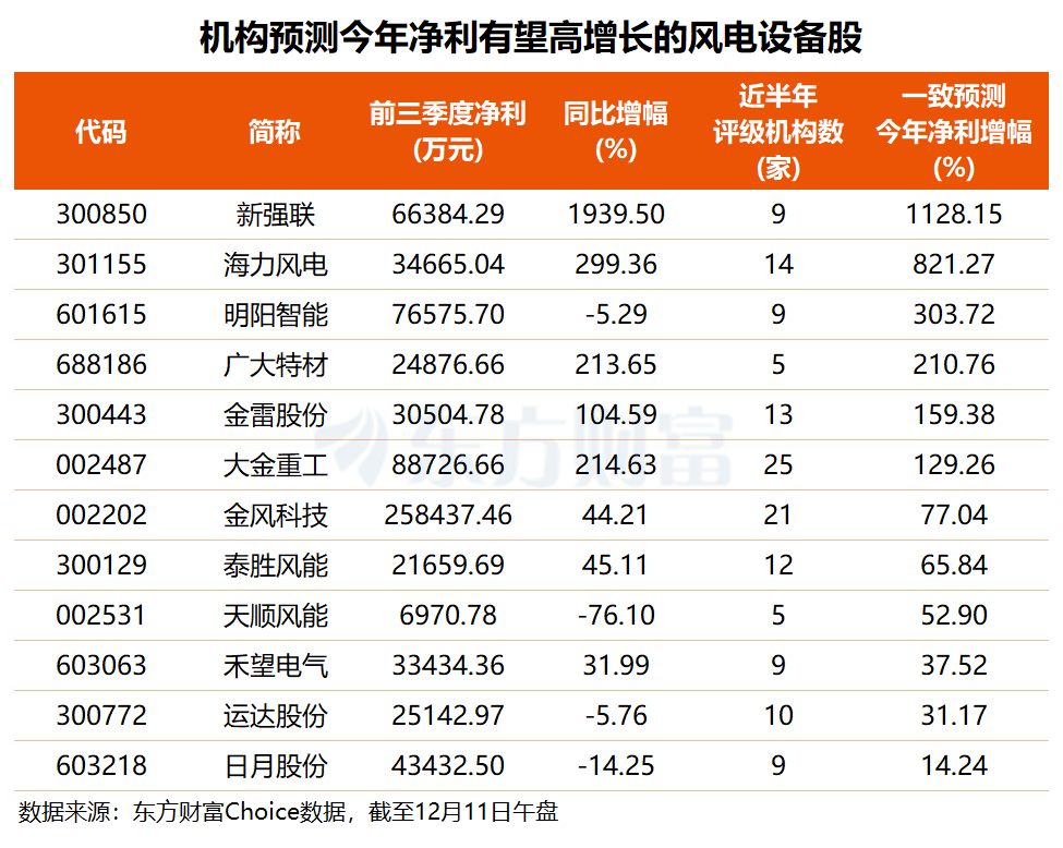 盈利预测方面,机构一致预测新强联 2025 年净利有望同比大增 11 倍,海力风电今年净利或增长超 8 倍。此外,机构预计明阳智能、广大特材、金雷股份、大金重工等 4 股净利均有望大幅增长。