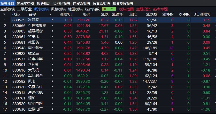 今日沪指震荡走低,创业板指小幅上涨。盘面上,超导概念、风电设备、可控核聚变、熔盐储能涨幅居前,商业航天在分化之后开始走强;而商业百货、预制菜概念、水产养殖、免税概念、社区团购、鸡肉概念表现不佳,跌幅居前。