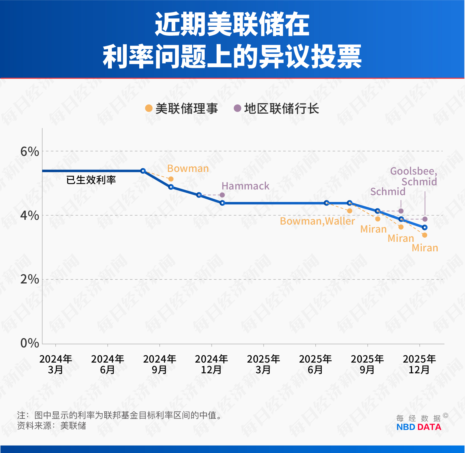 就本次降息 25 个基点,FOMC 12 名委员中 9 人投票赞成,有 3 人投反对票,反对票数量为 2019 年 9 月以来最多。从上图可以看出,美联储理事斯蒂芬·米兰 (Stephen Miran) 主张进行更大幅度的 50 个基点降息;而堪萨斯城联储主席杰弗里·施密德 (Jeffrey Schmid) 和芝加哥联储主席奥斯坦·古尔斯比 (Austan Goolsbee) 则认为应该维持利率不变。