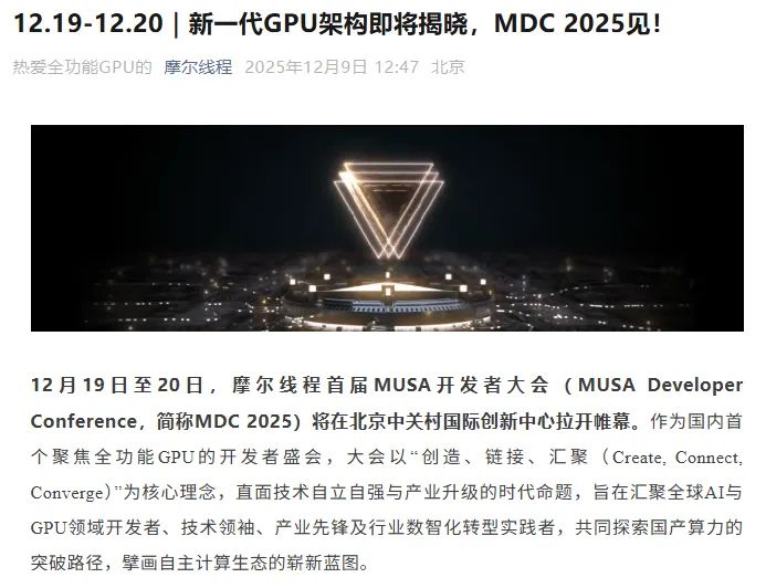 据摩尔线程官微消息,12 月 19 日至 20 日,摩尔线程首届 MUSA 开发者大会将在北京中关村国际创新中心拉开帷幕。
