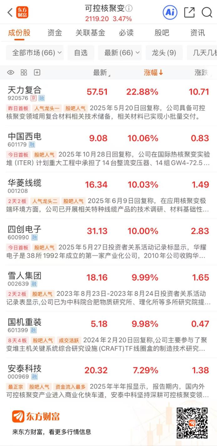 12 月 12 日,A 股可控核聚变概念股继续走强,截至早间收盘,板块暴涨 3.47%,掀起涨停潮。成分股中,天力复合涨超 20%,中国西电、华菱线缆、四创电子、雪人集团、国机重装涨停,安泰科技、中泰股份、中国核建、顺钠股份、常辅股份、东方电气、西部超导等多股涨超 5%。