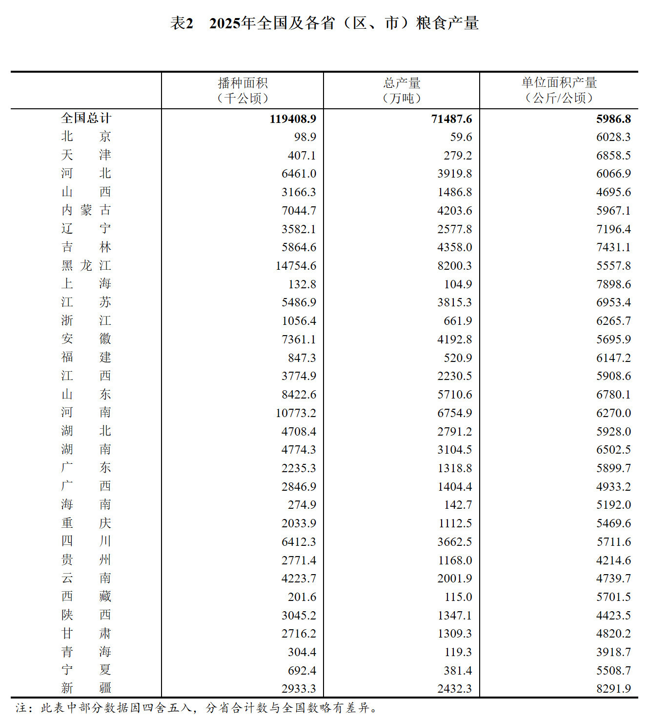 根据对全国 31 个省 (区、市) 的调查,2025 年全国粮食播种面积、单位面积产量和总产量分别如下: