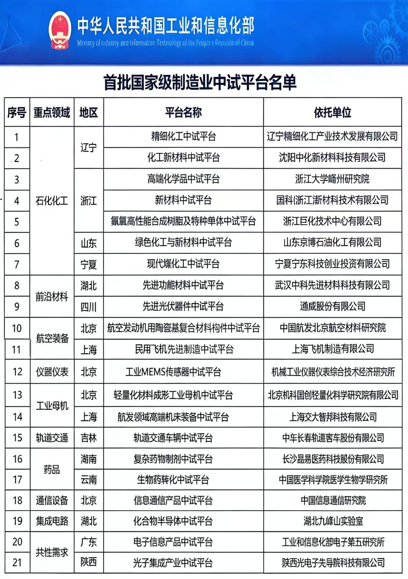 首批 21 家国家级制造业中试平台公布