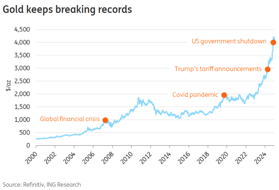 曼泰指出,金价向来反映全球经济与政治压力,通常在不确定性高企时期上涨。她写道,「全球金融危机后,金价突破 1000 美元,新冠疫情期间攀升至 2000 美元,随后在 4 月特朗普宣布关税时突破 3000 美元关口,而近期美国政府长期停摆期间,金价又站上 4000 美元。」